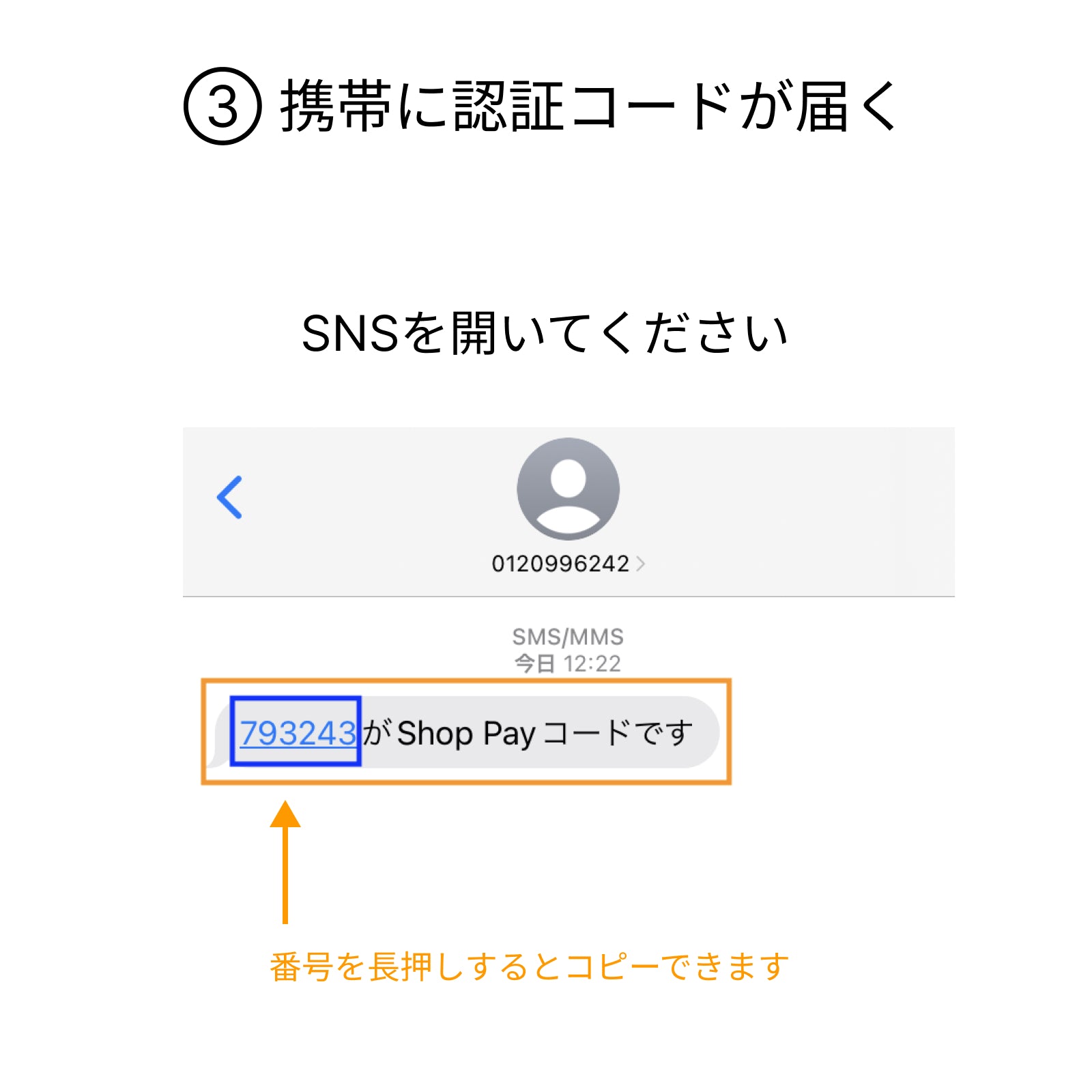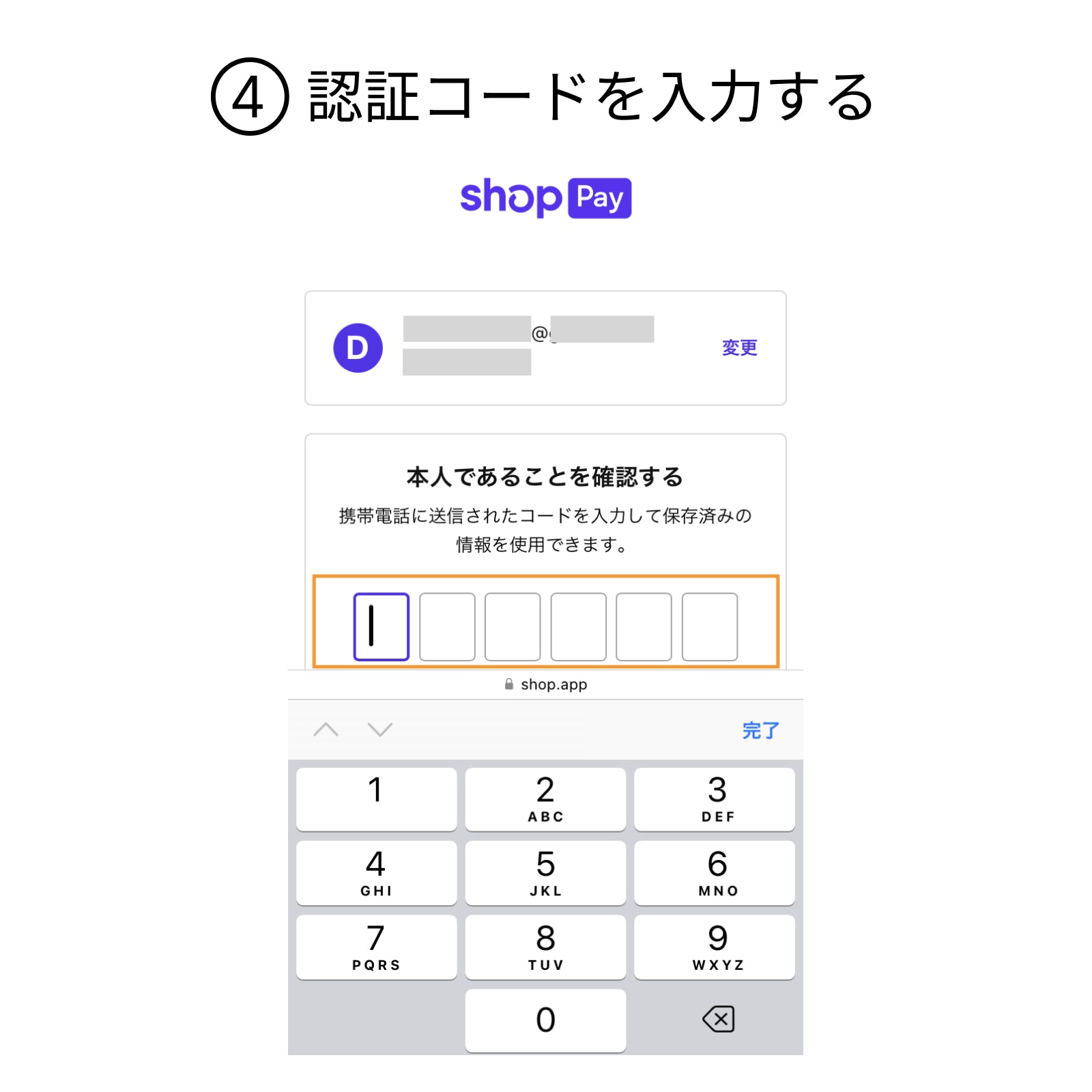 購入時には携帯電話番号宛にSMSで送られる6桁のShop Payコードを入力するだけで、住所やクレジットカードを再度入力すること無く、簡単にお買い物いただけます。